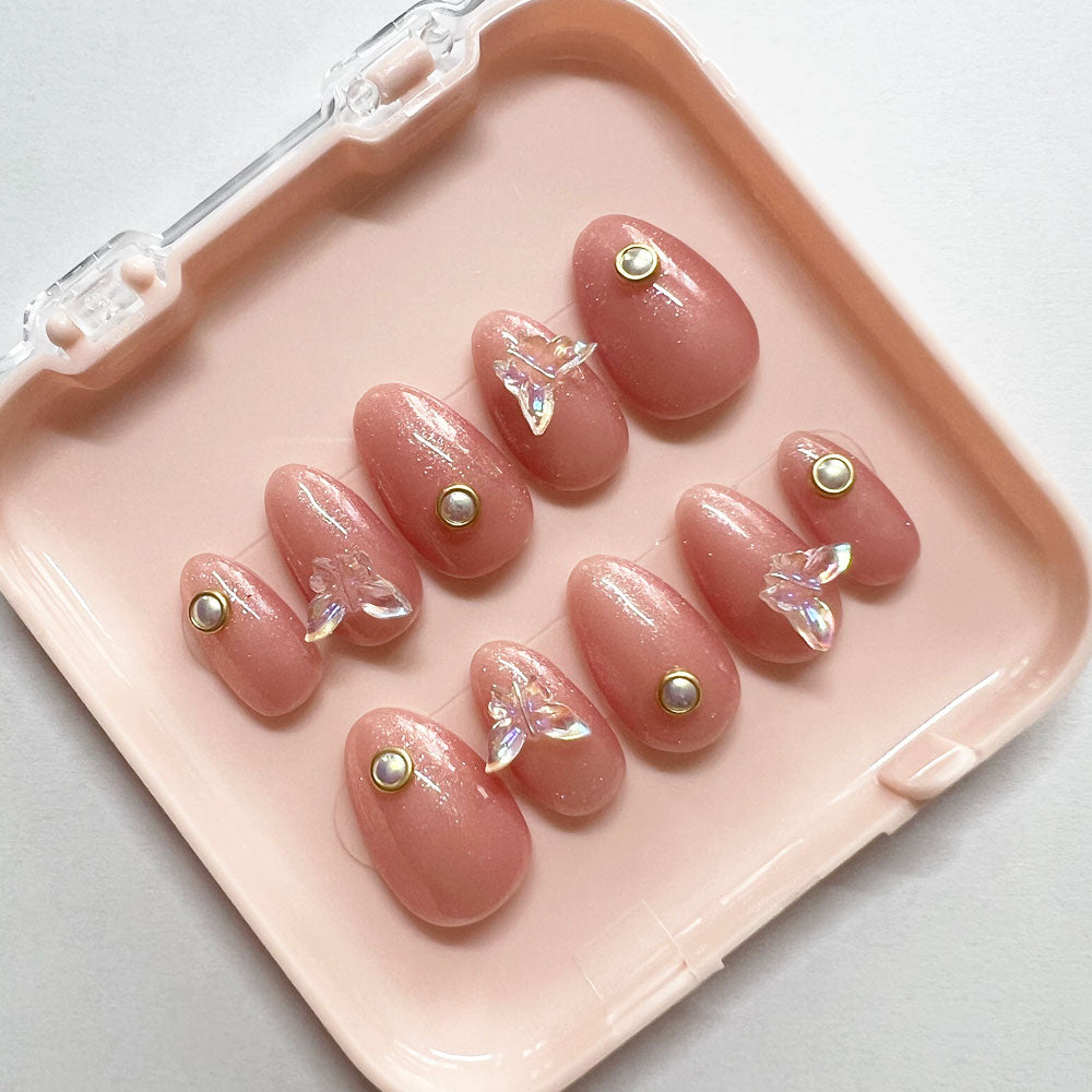 Sur un fond nude irisé, papillons et perles cohabitent pour un kit de press-on nails à la fois simple et sophistiqué.